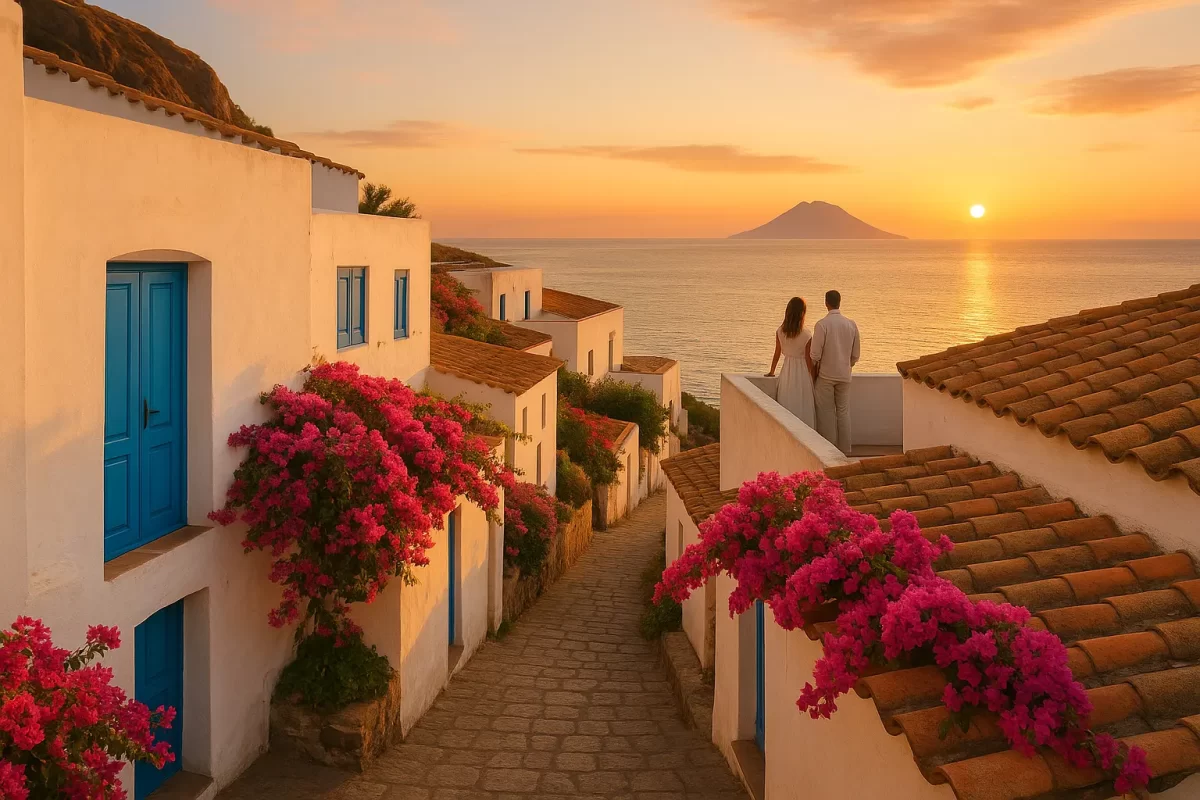 À Drautto, la route mène à des vues sur Basiluzzo, îlot volcanique fumant sous l’eau. La Villa Antika, drapée de glycine, se fond dans le paysage. Une pause sur la crête révèle les toits de Panarea scintillant sous le soleil, le bleu de la mer se fondant en un camaïeu infini. Le retour à San Pietro s’achève au crépuscule, les bougainvilliers s’embrasant sous les derniers rayons, l’île s’endormant au chant des grillons.